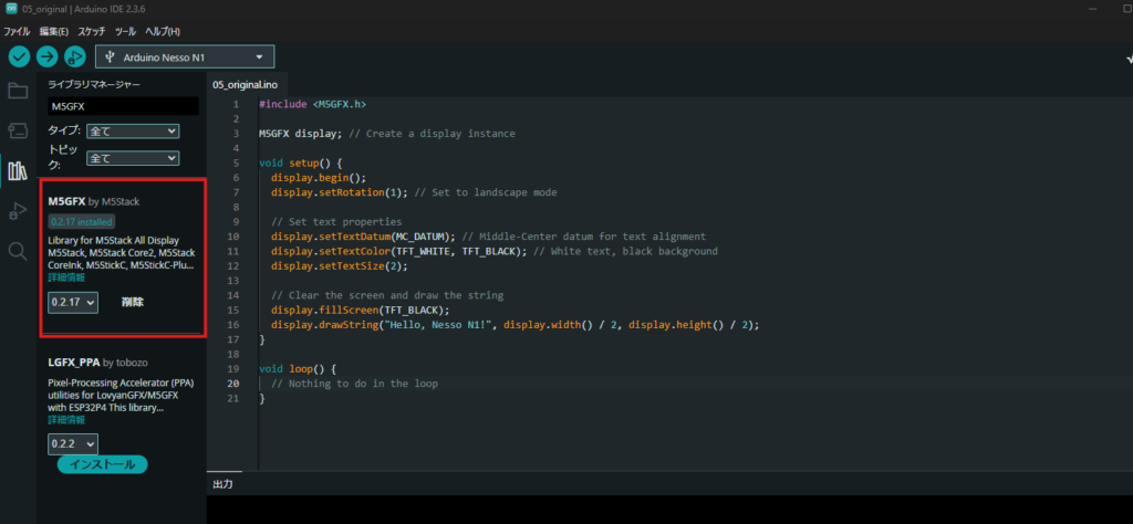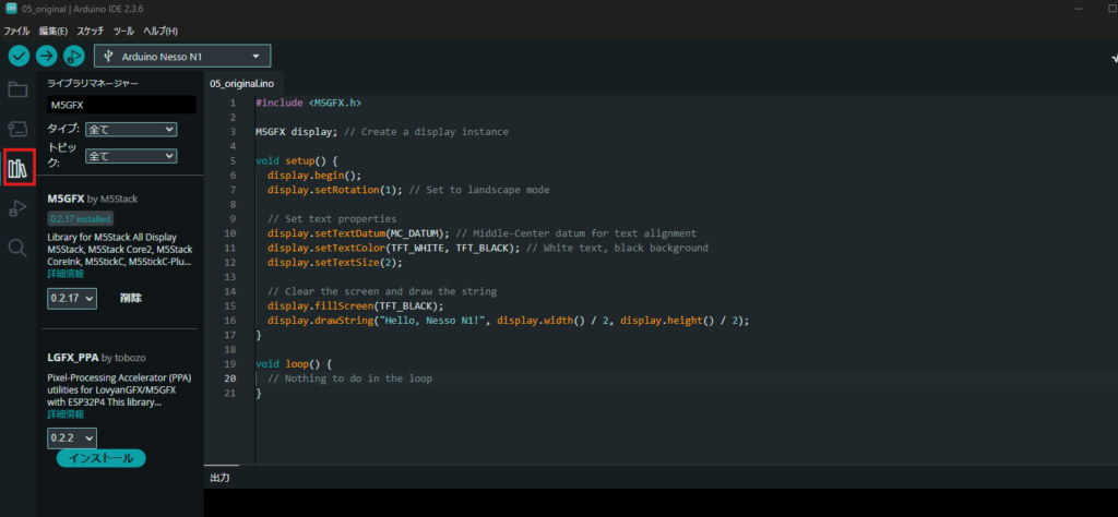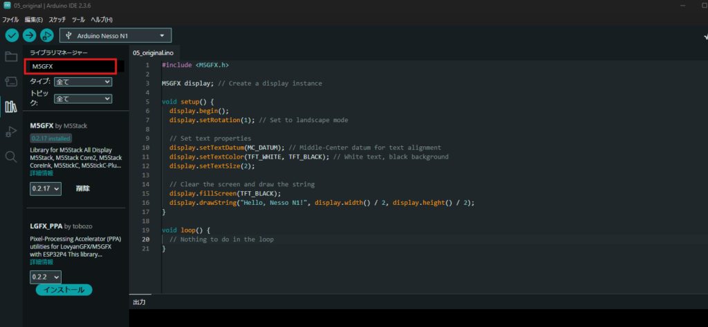 ここでは、ディスプレイ上に「Hello, Nesso N1!」と表示させてみましょう。