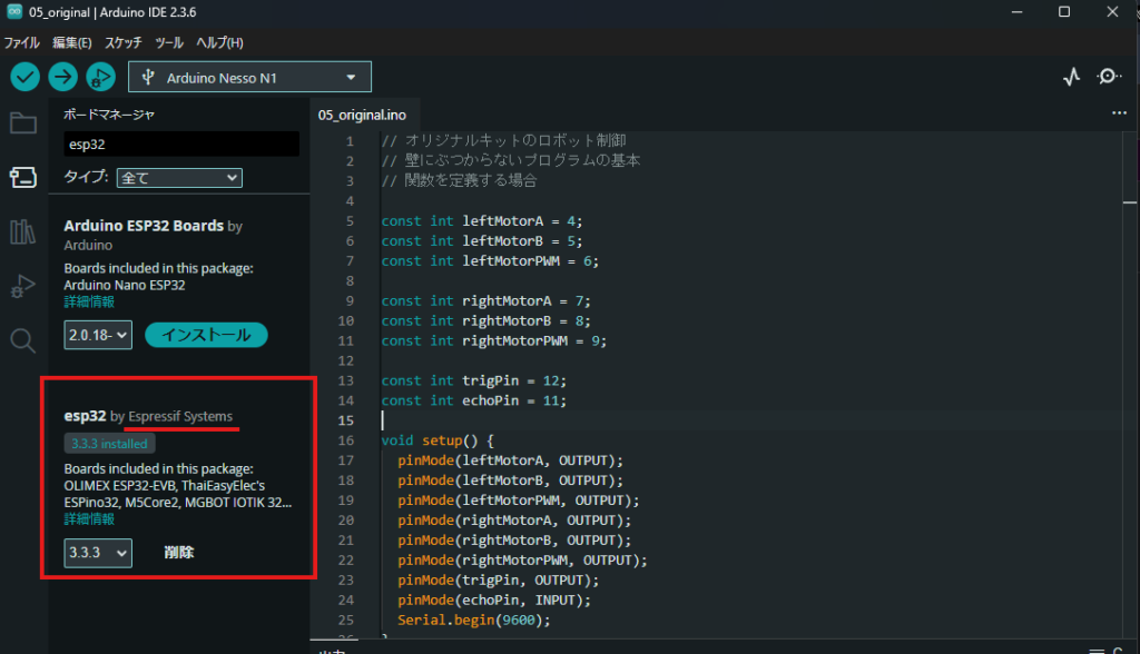 ③ 検索欄に「esp32」と入力し、「Espressif Systems」を探す