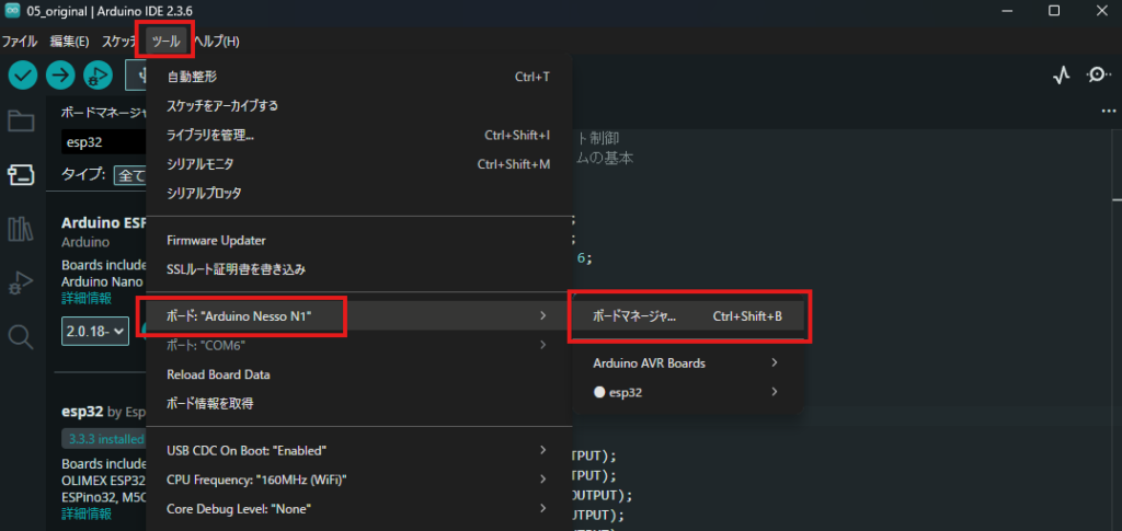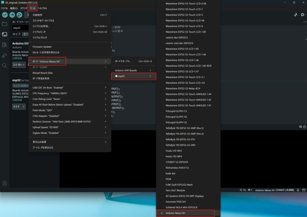 ① 「ツール」→「ボード」から Arduino NESSO N1 を選択